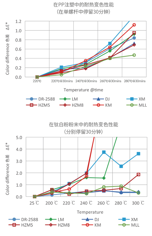 ■ 得益于對雜質含量的有效控制、優秀的無機表面處理和有機包覆技術,DR- 2588具有優秀的耐熱變色性能。